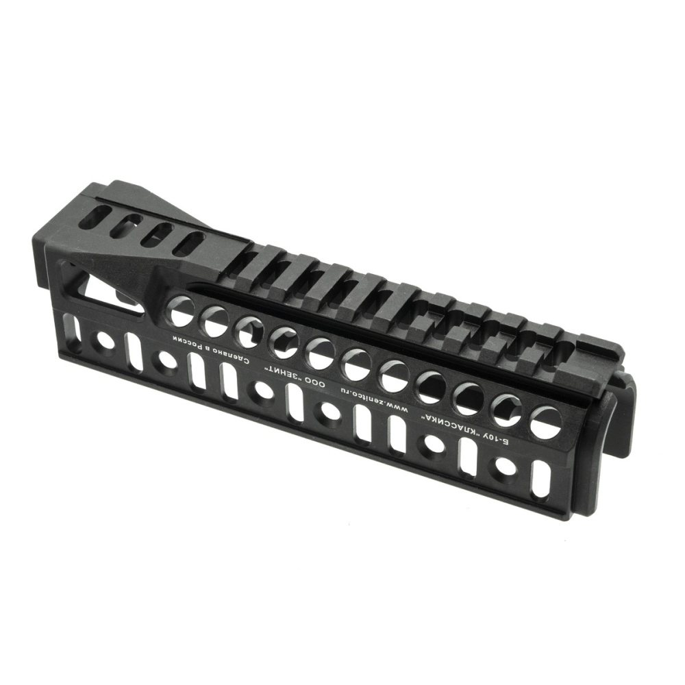 “B-10U handguard” rail is a milled product made of D16T aluminum alloy. It is installed in the place of the regular handguard of AK-103, -104, -105, -74M, -74S, AKMS, AKM, Saiga-MK v.30, Saiga-MK v.33, Saiga-MK 223 Rem. v.03, TG2, Vepr-K, Vepr-KM, VPO-209, AK-366-Lancaster. “B-10U handguard” rail forms a Picatinny rail on the bottom and two Basis rails on sides. Also it forms one additional Basis rail in the rear part on the bottom. Basis rail allows to install additional accessories directly on handguard.